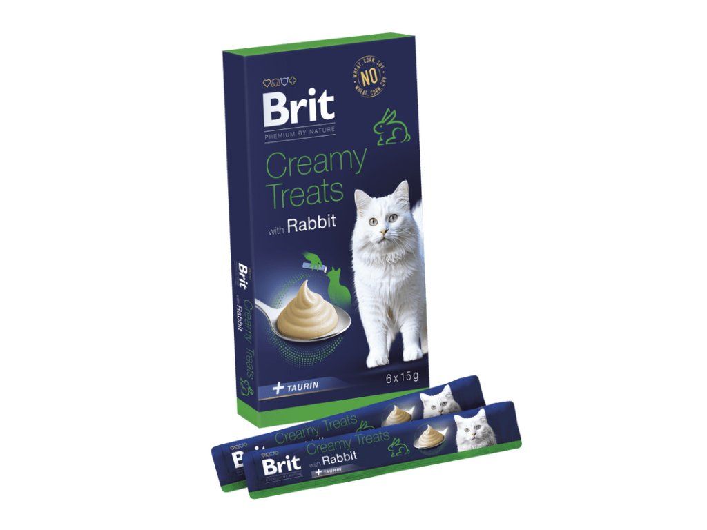 Brit Premium by Nature Cat Creamy Treats with Rabbit představují moderní a atraktivní formát kočičího pamlsku v podobě jemného krému. Díky lahodné konzistenci jsou vhodné pro podávání přímo z ruky při budování vztahu s kočkou nebo jako chutné zpestření běžné dávky krmiva. Receptura obsahuje králičí maso a vedlejší výrobky živočišného původu a je doplněna o taurin. Složení je bez pšenice, sóji a kukuřice. Pamlsky jsou určeny jako doplňkové krmivo – při podávání je potřeba upravit hlavní krmnou dávku. Praktické jednotlivé porce 15 g umožňují snadné dávkování a zachování čerstvosti každé dávky.