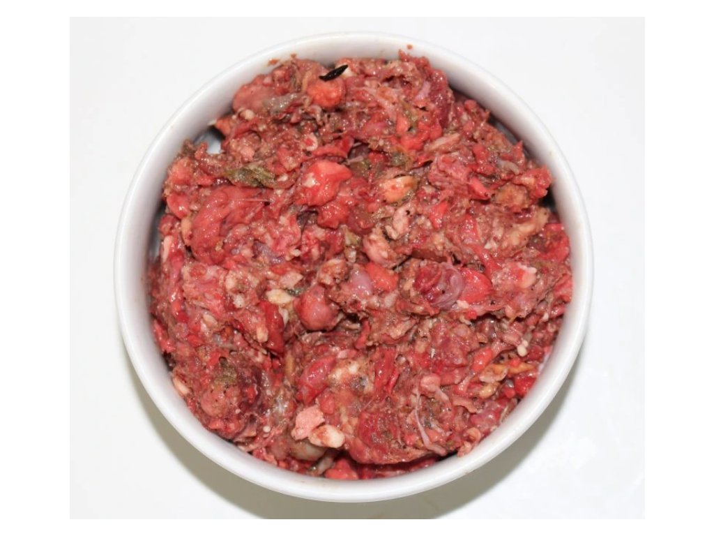 30 % hovězí ořez, 30 % hovězí plíce, 30 % krůtí skelet,10 % hovězí dršťky.