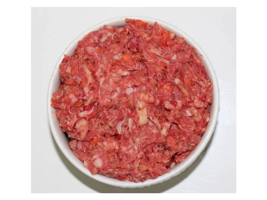 Složení: 60% králičí maso s kostí, 20% srdce, plíce, ledvinky, 20% zelenina (mrkev a zelí nebo mrkev a petržel dle dostupnosti zeleniny)