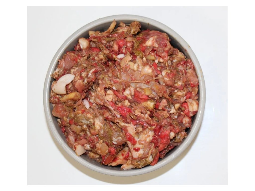 50% vepřová svalovina, 20% hovězí chrupavka, 20% hovězí plíce a 10% neprané dršťky