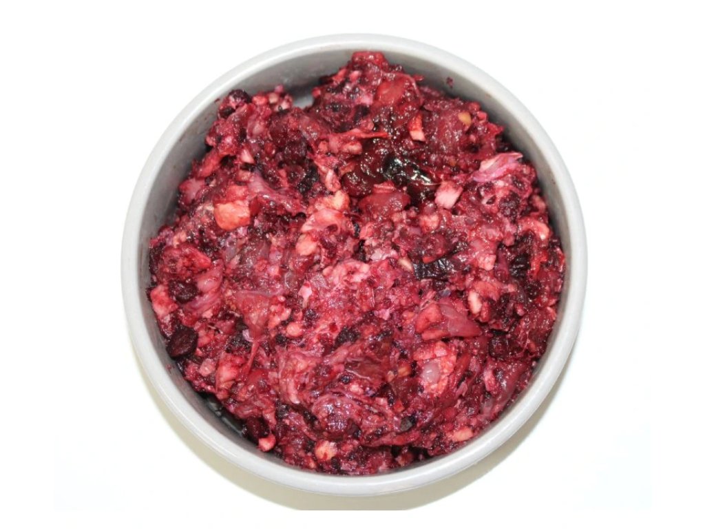 40% zvěřina ořez, 30 % krůtí skelet, 30% sezónní zelenina (červená řepa a zelí nebo petržel)